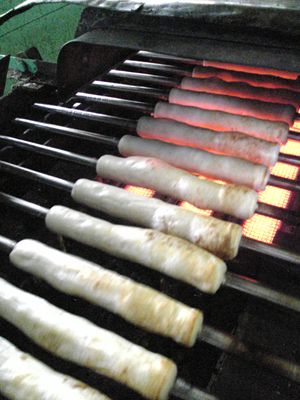 魚のすり身を入れ、鉄の棒に巻き付けます